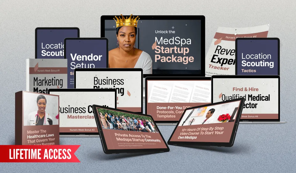 The Medspa Startup Package will help nurses, nurse practitioners, and physician assistants with no background or experience in aesthetics start and operate their Medspa business and make $100k in their first year of business without quitting their job or using their own money.